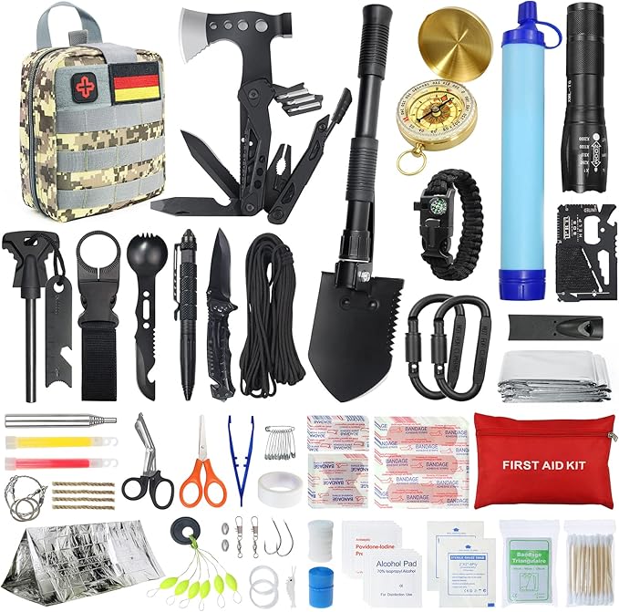 Das WayinTop 180-teiliges Survival Kit ist eine komplette Notfall- und Outdoor-Ausrüstung, ideal für Camping, Wandern, Abenteuer oder den Einsatz im Notfall. Dieses umfangreiche Set enthält hochwertige Werkzeuge wie Multi-Tool Hammer, Axt, Wasserfilter-Stroh, Kompass, Taschenlampe, Messer und ein vollständiges Erste-Hilfe-Set, alles sicher verpackt in einer robusten Aufbewahrungsbox.Ob für den täglichen Gebrauch, Notfälle im Freien oder als durchdachtes Geschenk für Männer, Abenteurer oder Senioren – dieses Survival Kit bietet Sicherheit und Zuverlässigkeit in jeder Situation.